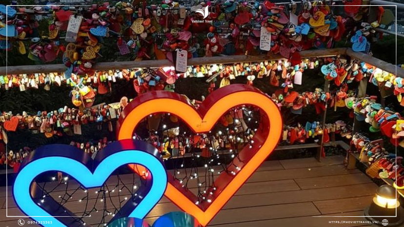 Đài treo ổ khóa tình yêu: Ở tại khu vực sân thượng sẽ có một đài quan sát ngoài trời khá rộng lớn, nơi đây chính là nơi mà các cặp đôi có thể treo ổ khóa tình yêu của mình . Đến với khu vực này bạn sẽ thấy những hàng rào đầy những ổ khóa với rất nhiều màu sắc, hình dáng và kích cỡ. Trên những ổ khóa này sẽ có tên của hai người và khóa chặt lại với nhau, thể hiện mong ước tình yêu luôn bền chặt, gắn bó của họ.