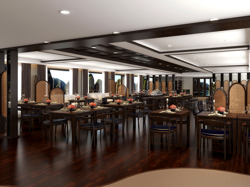 Bữa trưa tuyệt vời được phục vụ tại Nhà hàng Tahiti trong khi du ngoạn trên Vịnh Lan Hạ nguyên sơ. Vịnh có hàng trăm hòn đảo lớn nhỏ, khiến nơi đây trở thành một khung cảnh vô cùng tuyệt vời để ngắm nhìn khi dùng bữa.