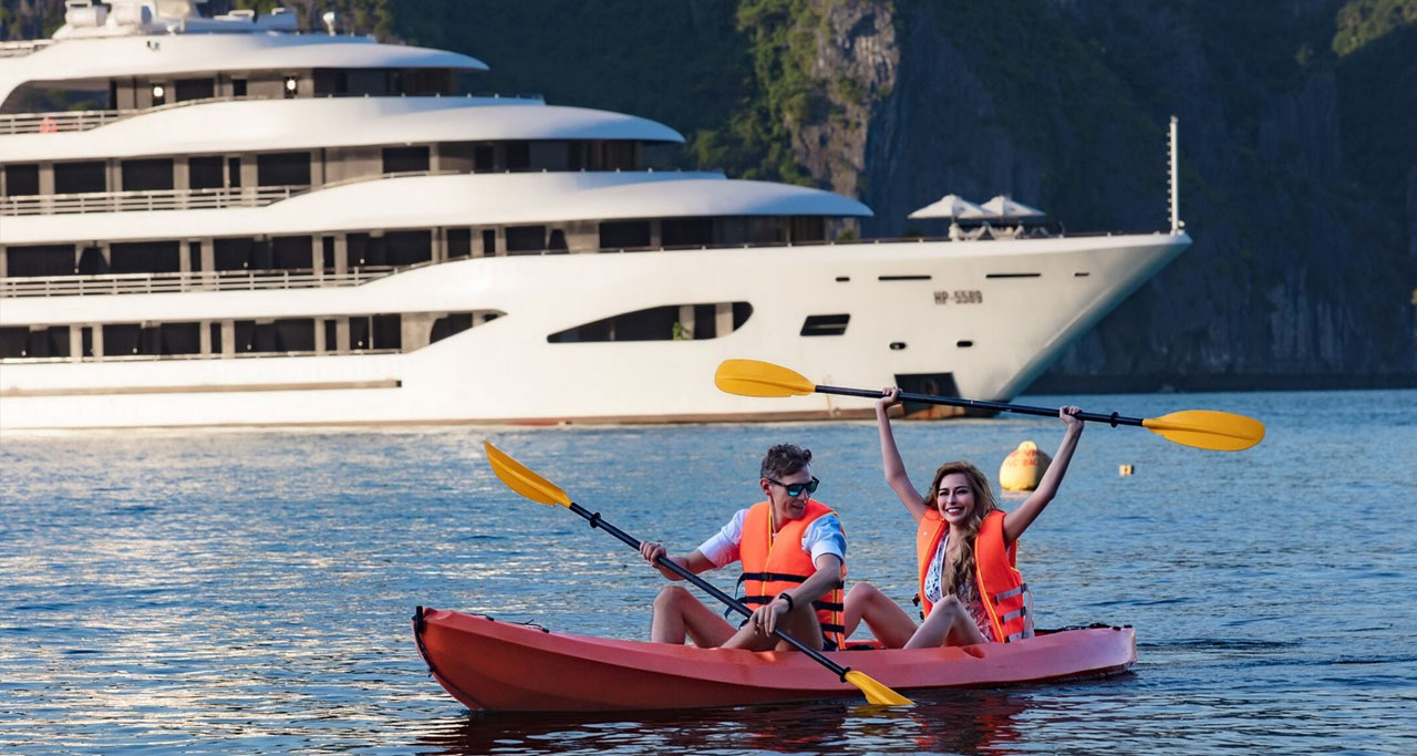 Du khách - những người chọn không tham quan Làng Việt Hải - có thể thử chèo thuyền kayak hoặc đơn giản là bơi trong làn nước trong vắt trên bãi biển gần thuyền. Xin lưu ý rằng nếu bạn chọn tham quan Làng Việt Hải, bạn sẽ không có đủ thời gian để bơi hoặc chèo thuyền kayak khi quay trở lại Du thuyền Scarlet Pearl Cruises 5 sao.